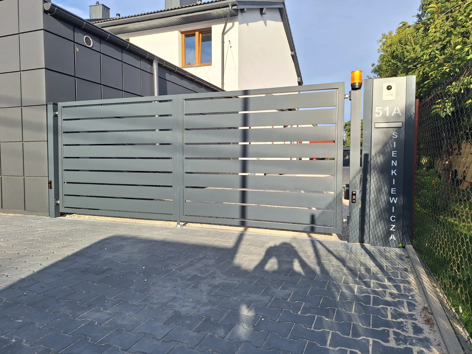 Ogrodzenie palisadowe poziome – jasnoszare z bramą przesuwną