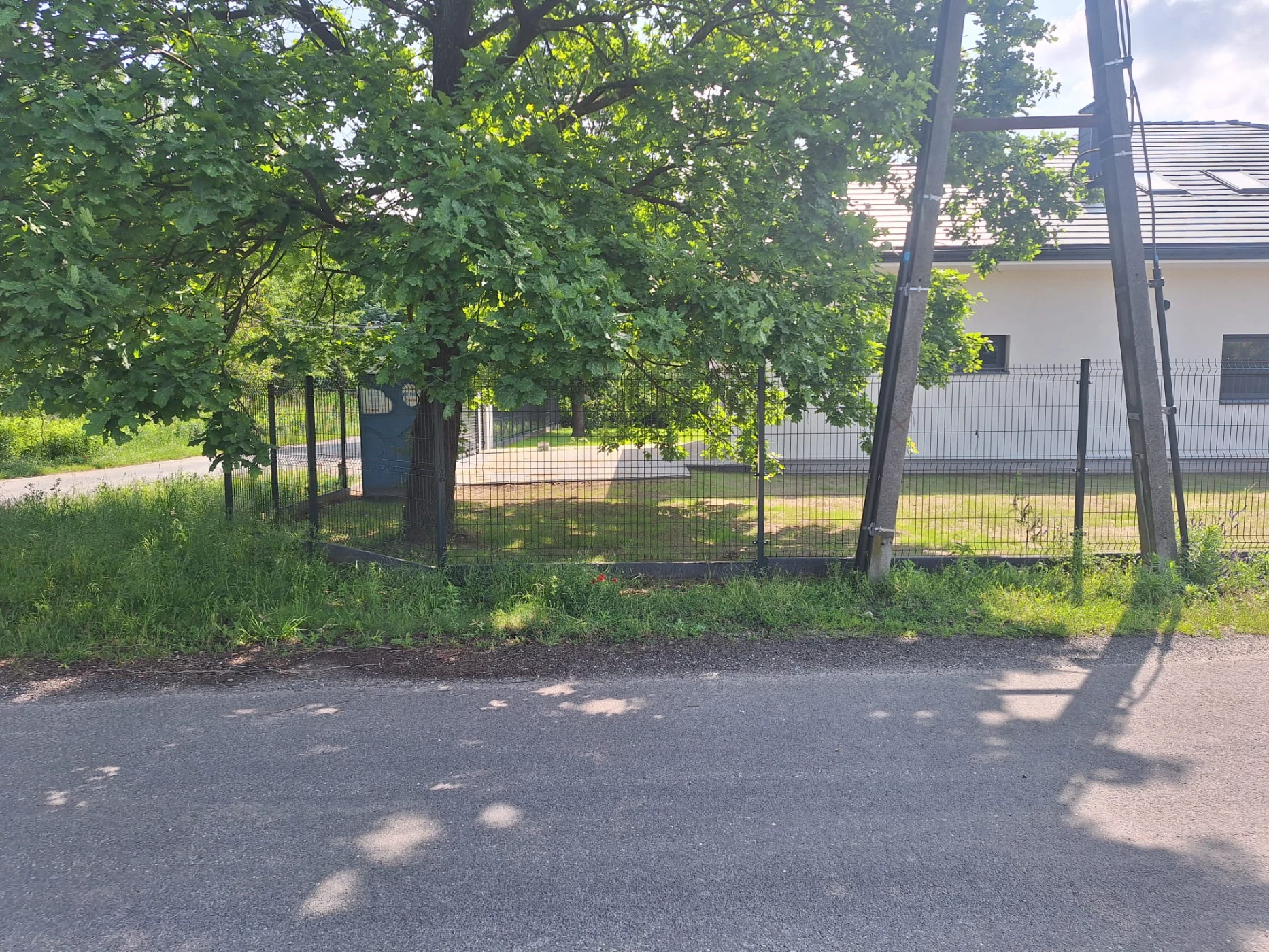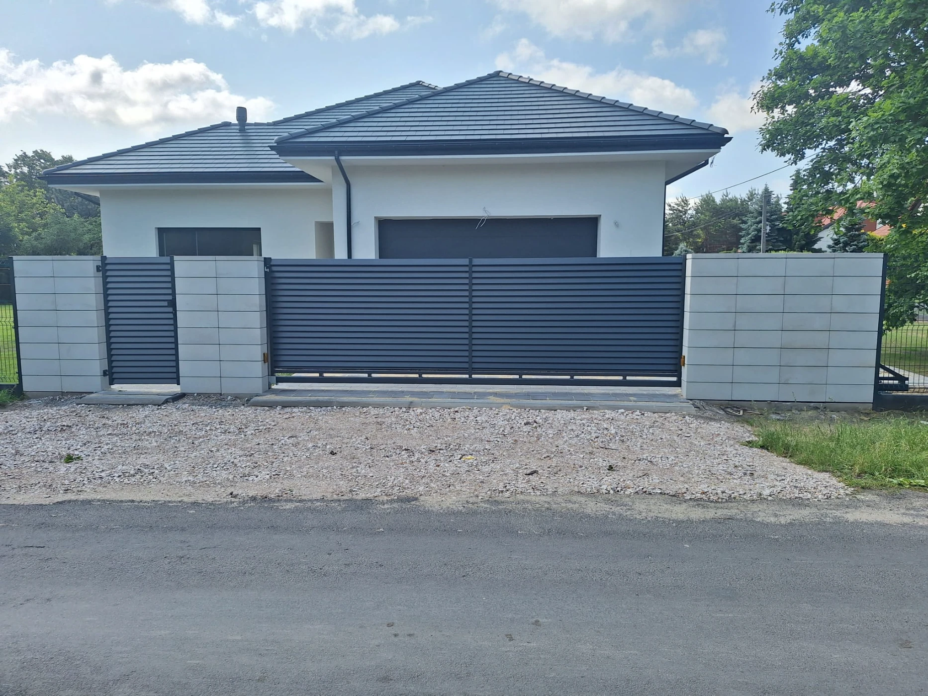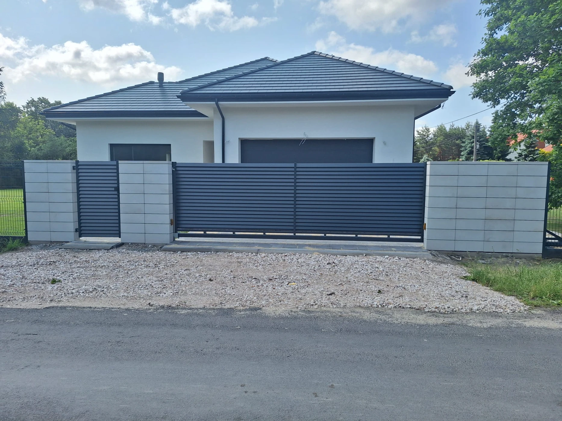 Ogrodzenie panelowe działki z frontem z bloczków oraz bramą i furtką żaluzjową.