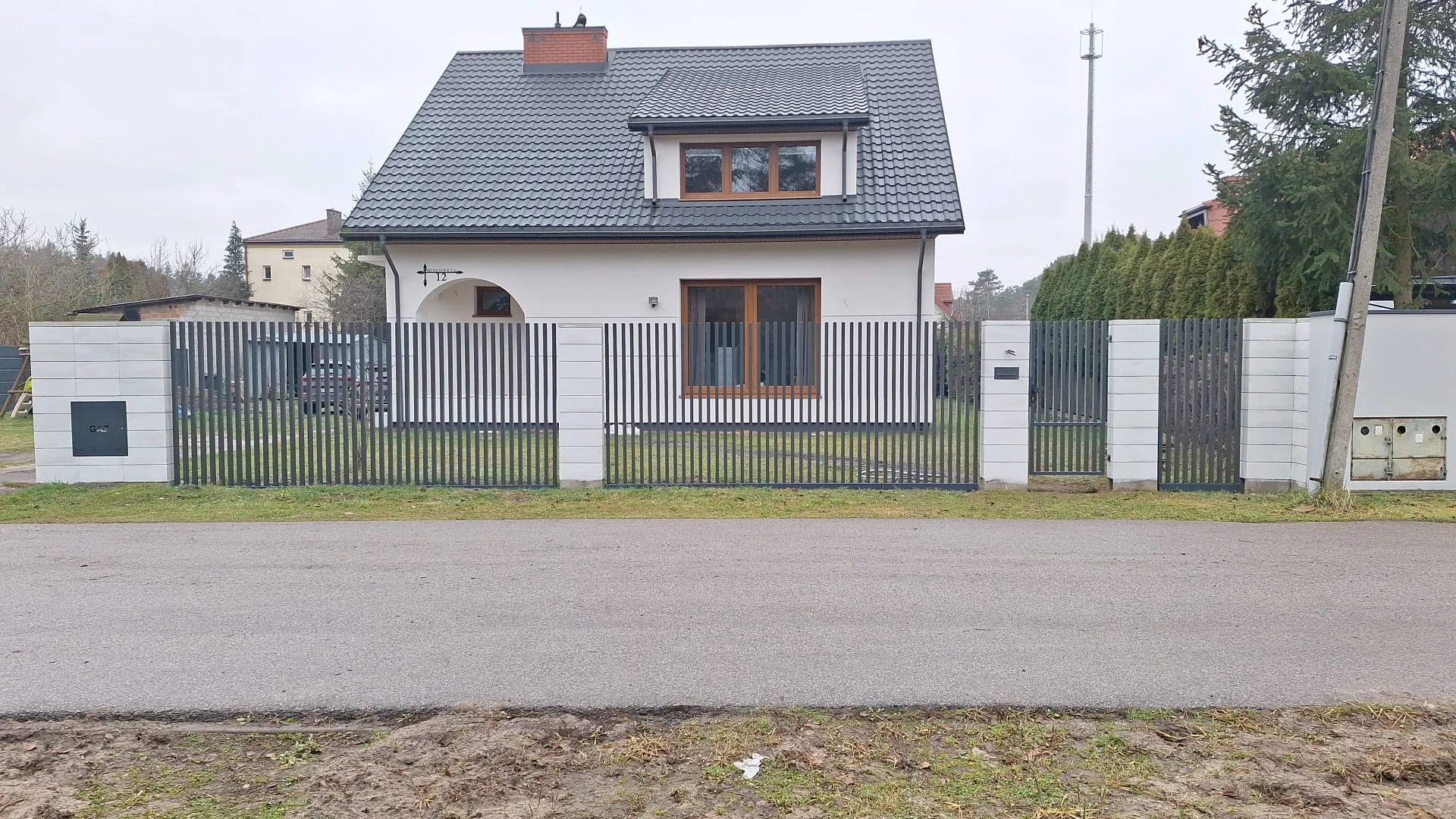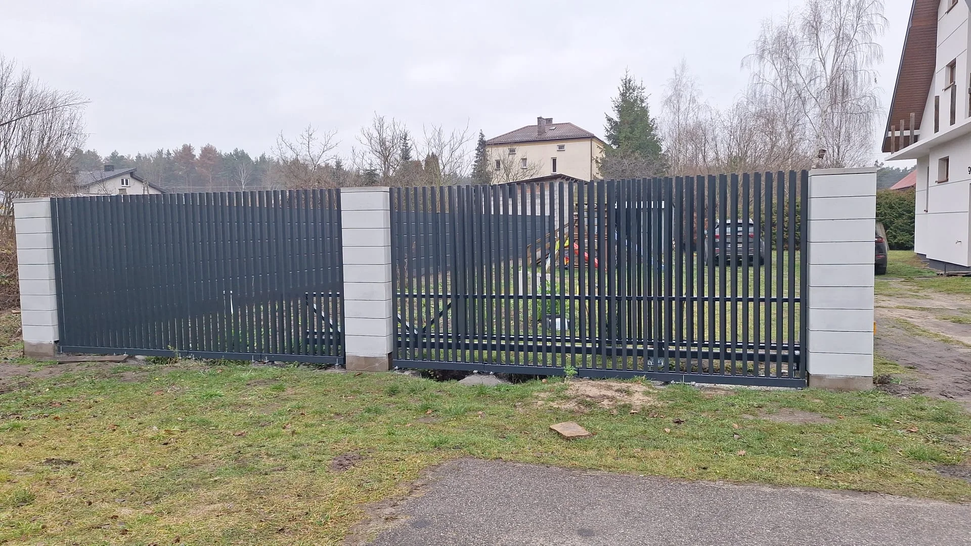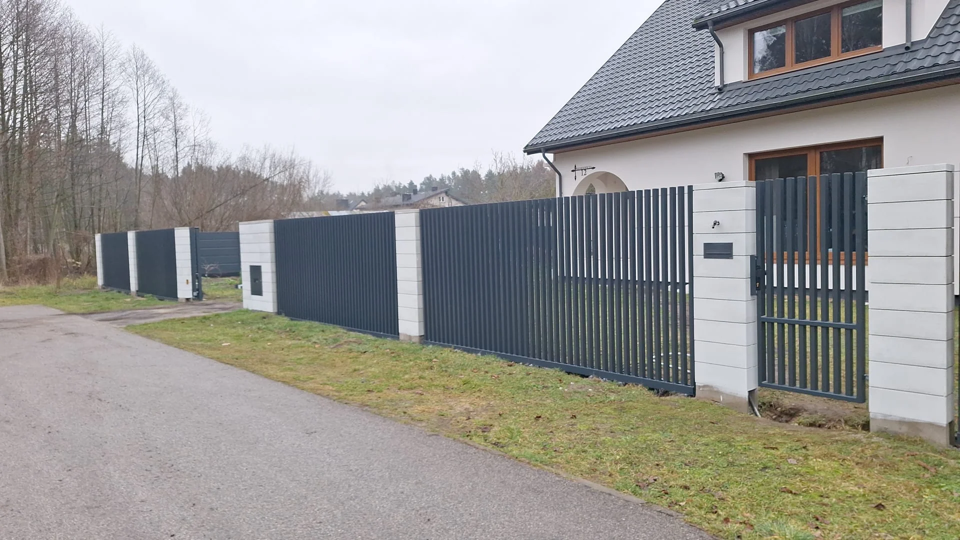 Ogrodzenie posesji, gdzie od frontu zastosowano pionowe ogrodzenie palisadowe, a po bokach palisady zapewniające prywatność. Całość uzupełnia brama z automatyką.