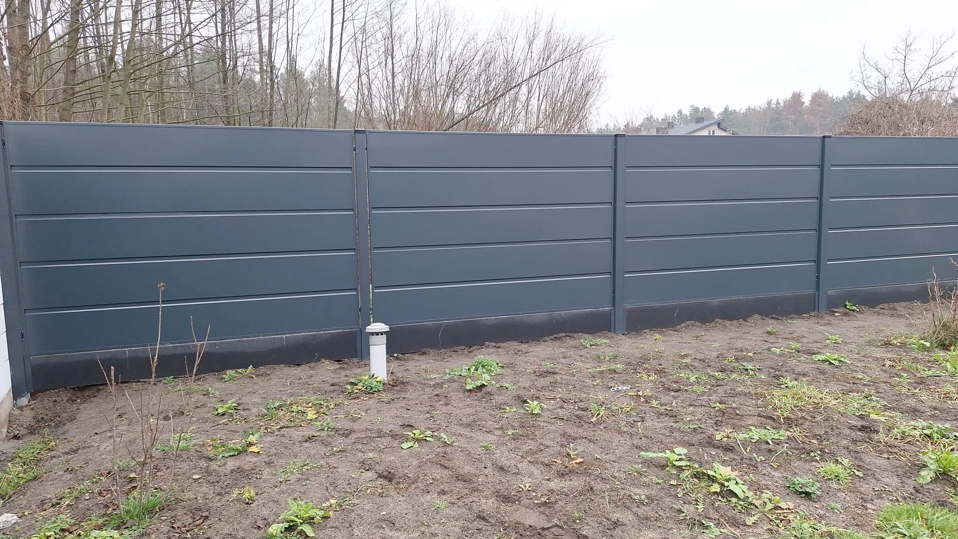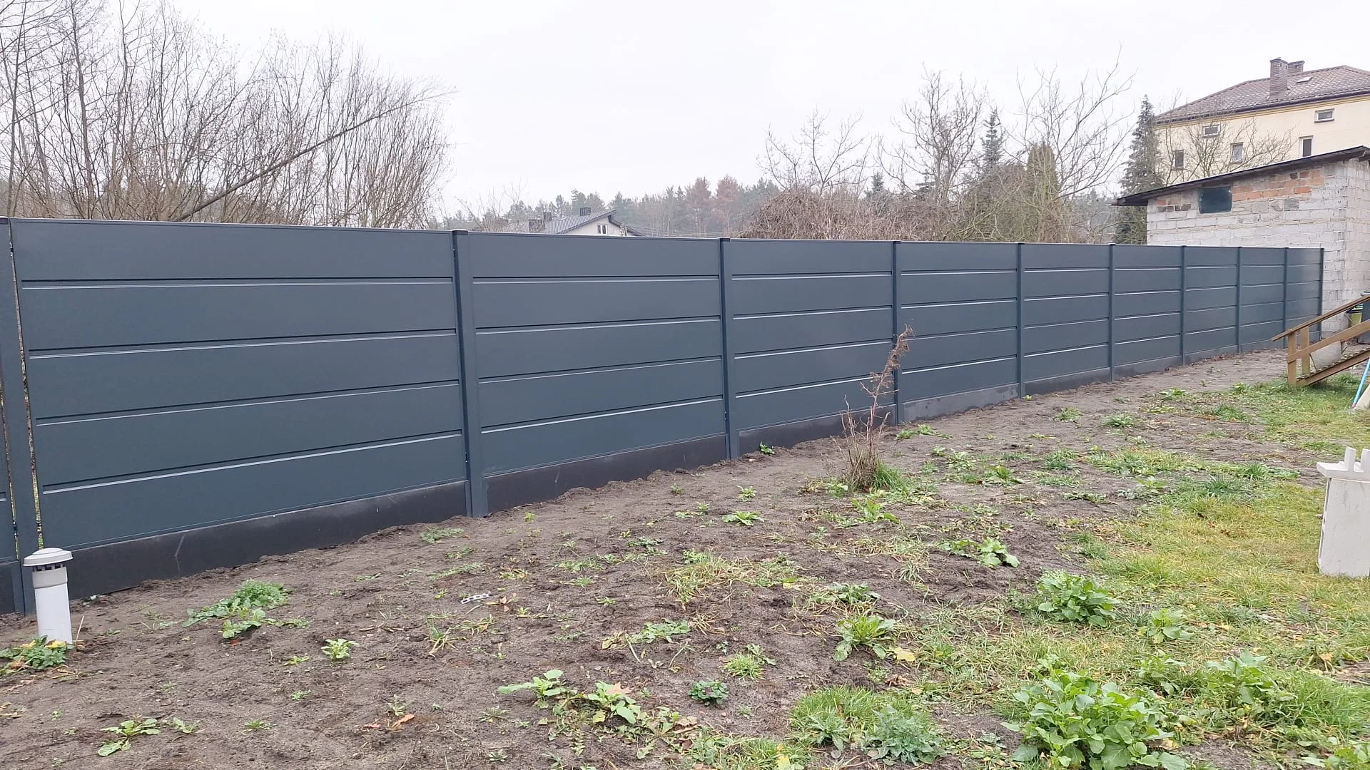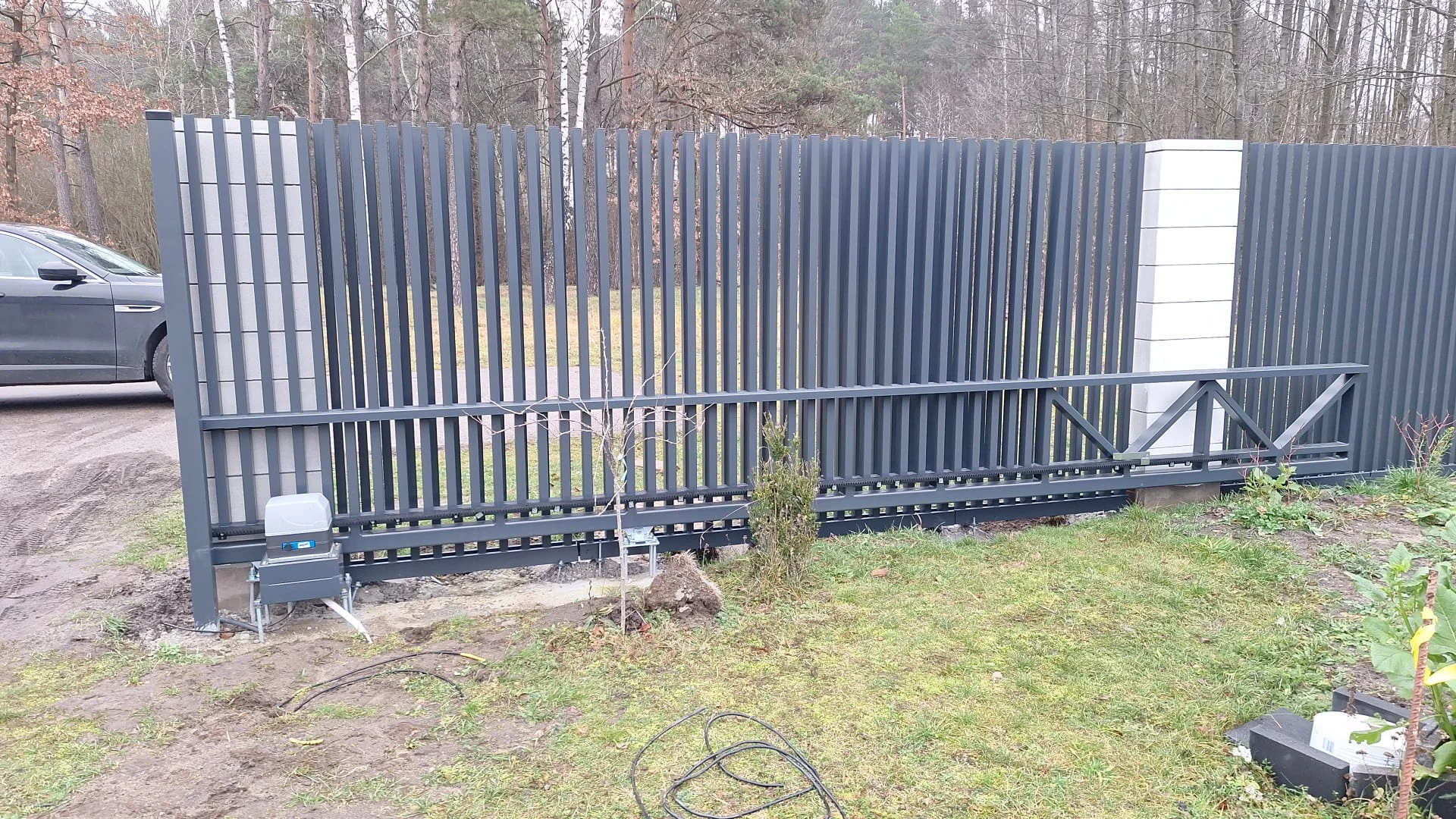 Ogrodzenie posesji, gdzie od frontu zastosowano pionowe ogrodzenie palisadowe, a po bokach palisady zapewniające prywatność. Całość uzupełnia brama z automatyką.